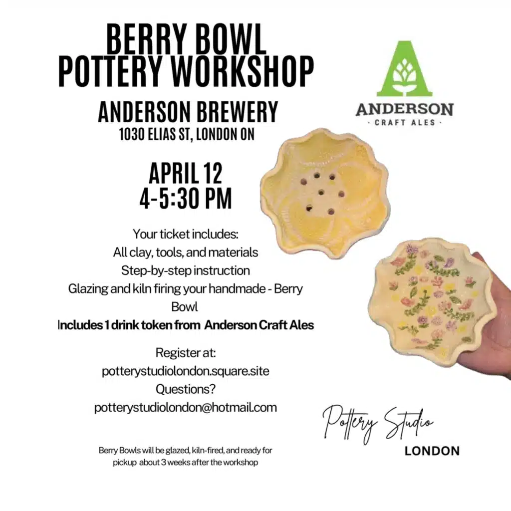 Join us at Anderson Brewery on April 12, from 4-5:30pm for a beginner-friendly, Berry Bowl pottery workshop!